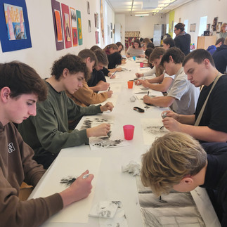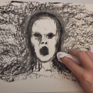 Nach Besichtigung der zweiten Ausstellung von Sarah Straßmann, in der sich die Künstlerin mit der Nutzung von Smartphone-Technologien, dem Schönheitsideal und verstärkten rassistischen Stereotypen unterstützt durch die Smartphone-Technologie auseinandersetzt, hatten die Schüler:innen die Möglichkeit, sich kreativ in einem Workshop zu betätigen und eine Zeichnung zum Thema mit Zeichenkohle zu gestalten.