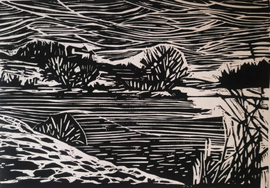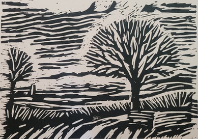 Im Kunst- und Gestaltungsunterricht lernten die Schüler:innen der Klassen 4C und 4D die druckgrafische Technik des Linolschnitts kennen und verbanden Landschaftsfotografie mit digitalen und traditionellen Drucktechniken.